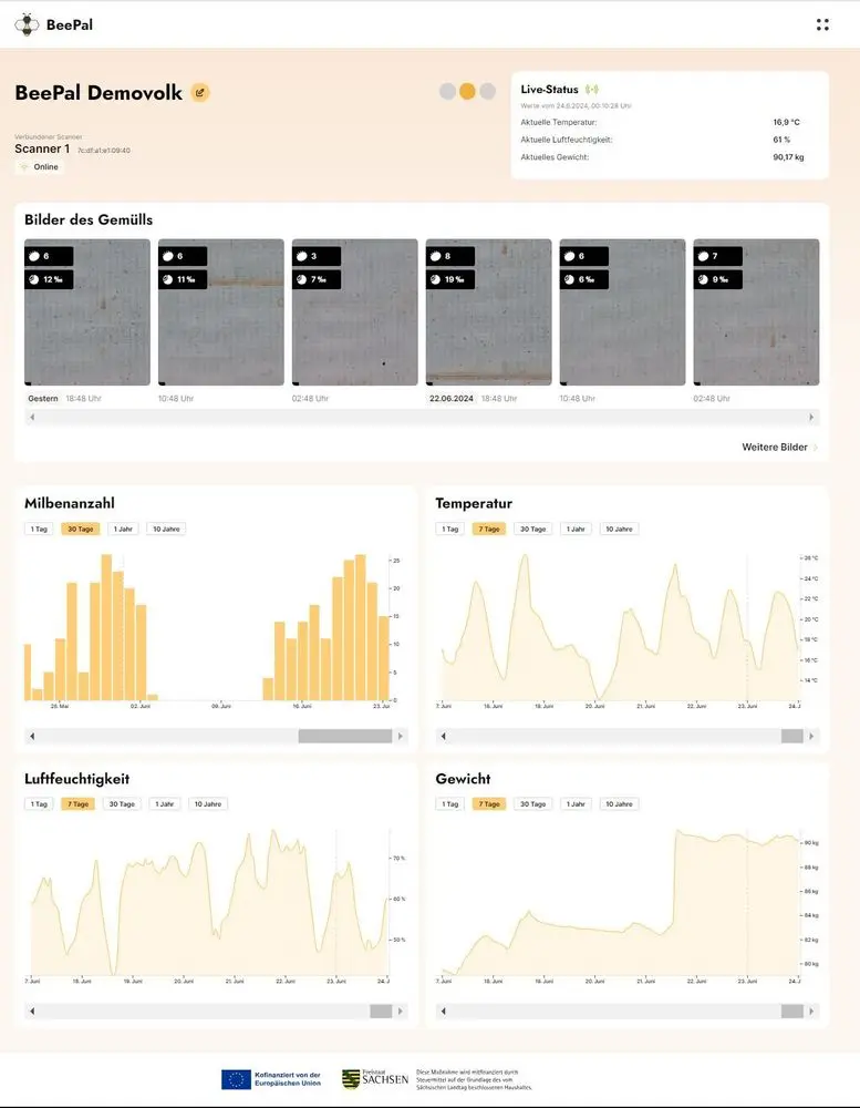 Diagramme zu Temperaturverlauf, Gewicht, Luftfeuchtigkeit, täglicher Milbenanzahl und natürlich die originalen Bilder der Scans mit Auswertung der KI.