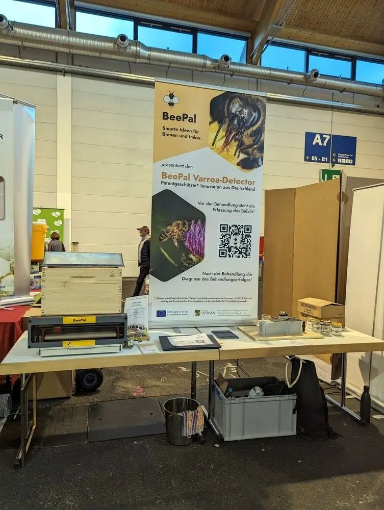 Die sehr kurzfristige Anmeldung und die Unkenntnis der Gegebenheiten vor Ort resultierten in einem improvisierten Messeauftritt. Nichtsdestotrotz war die Messe für uns ein voller Erfolg. Erst Tage vor der Messe erhielten wir vom Deutschen Patent-. und Markenamt unsere Patenturkunde für den Varroa-Detektor. Der Messeaufsteller und die Flyer waren zwei Tage vor der Messe fertig...